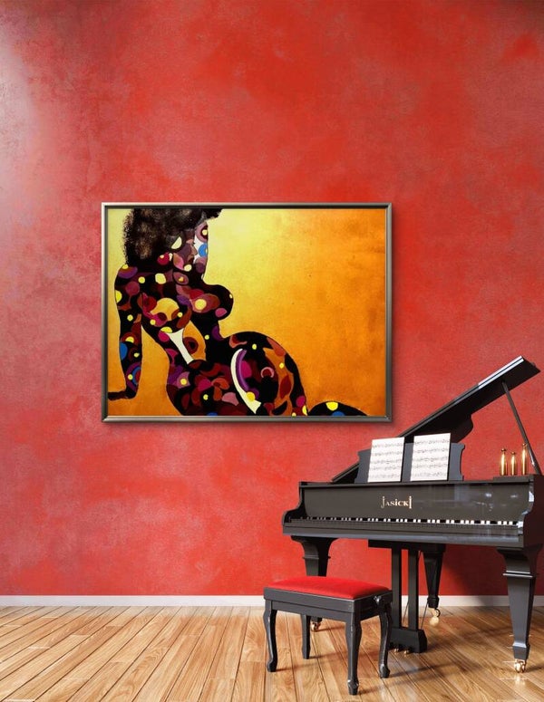 Cette œuvre audacieuse et envoûtante rend hommage à la femme noire dans toute sa puissance sensuelle et artistique. Sur un fond doré éclatant, symbole de chaleur et de lumière, se détache une silhouette féminine aux courbes harmonieuses, recouverte de motifs abstraits et colorés rappelant la richesse des tissus africains et l’énergie de la vie.